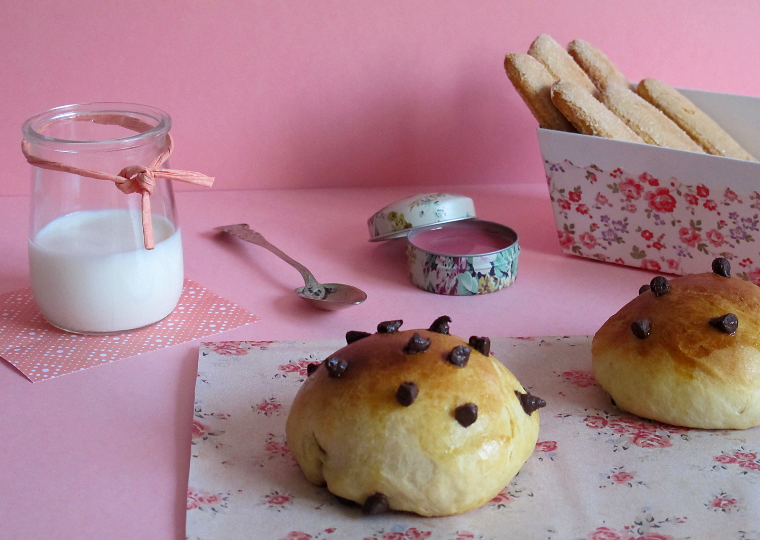 Dejamos reposar la masa hasta que doble su volumen. Después hacemos las bolitas partiendo la masa a la mitad, y luego a la mitad, y así sucesivamente, hasta tener 24. Añadimos las pepitas de chocolate a la masa envolviéndolas para que queden dentro. Pintamos los bollitos con la ayuda de una brocha con huevo batido, y los adornamos con alguna pepita por fuera. Finalmente, los metemos en el horno a 180º durante 10 o 15 minutos hasta que esté dorados.