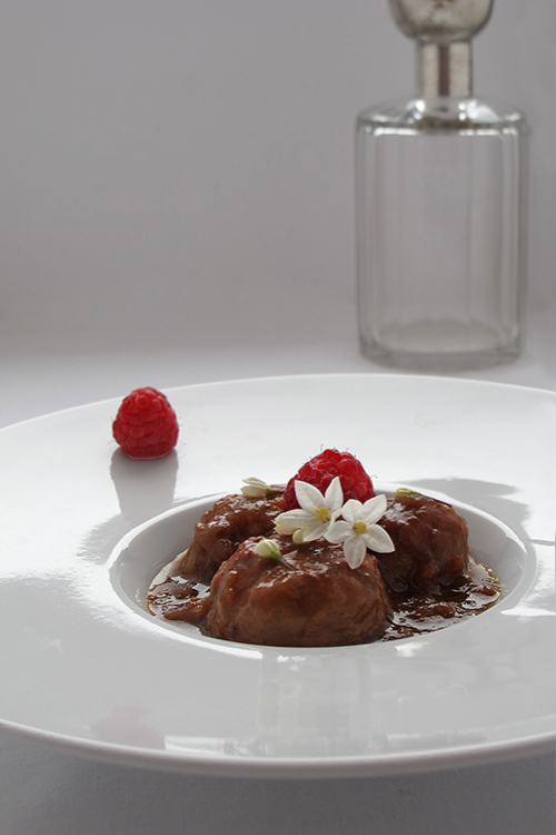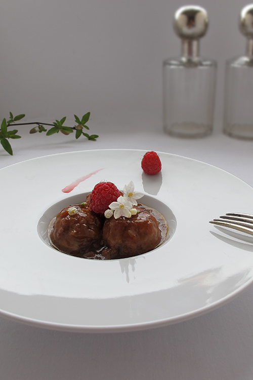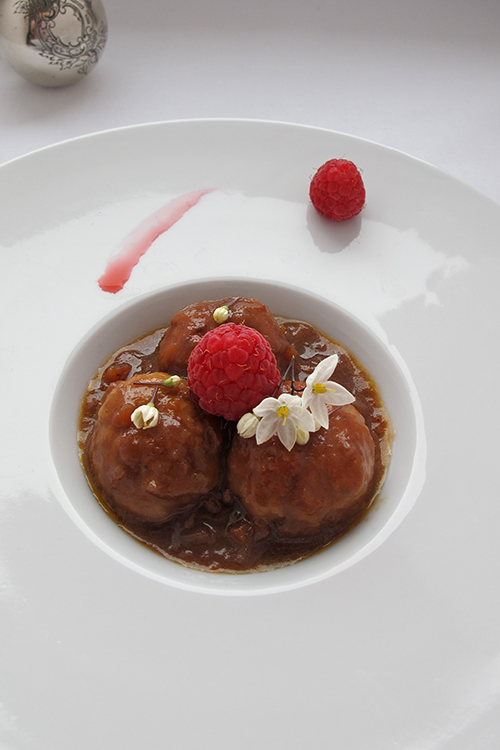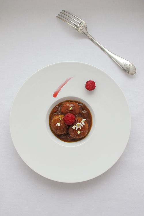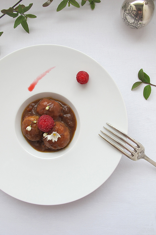 Añadimos a la cacerola de las albóndigas, y las cocemos otros diez minutos. Añadimos unas frambuesas frescas y listo!