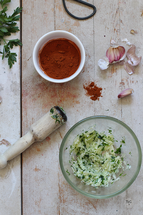 La vida de esta receta se la da el majado de ajo y perejil. Por mí cuanto más mejor, aunque para unas cuatro personas con una cabeza de ajos será suficiente. Vuelvo a lo mismo; el ajo mejor de aquí. Importamos ajo y lo encontramos en los supermercados, pero en España hay una producción excelente en algunas zonas. En La Rioja también.