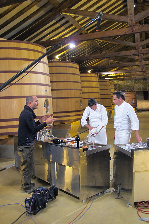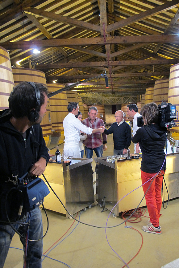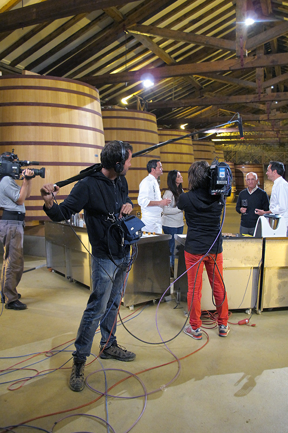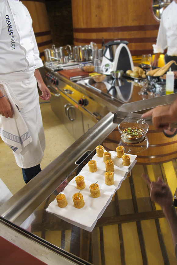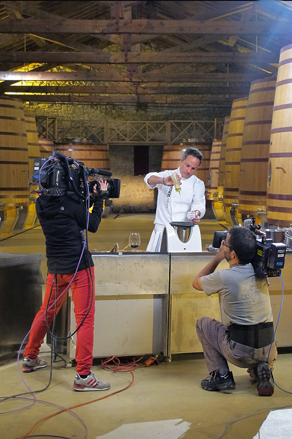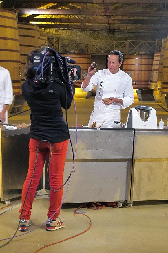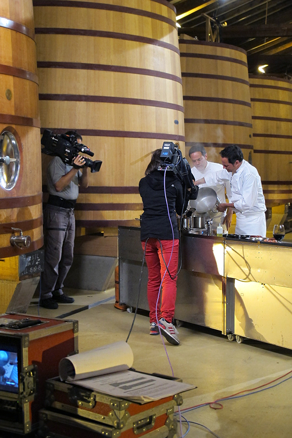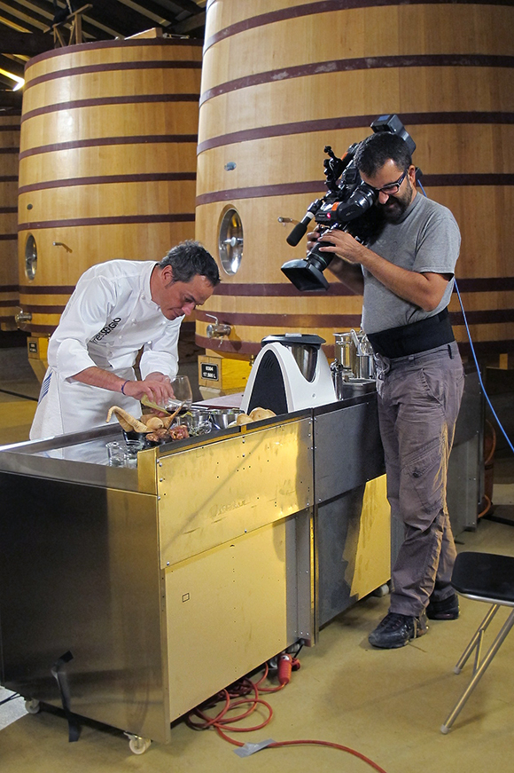 Grabar un programa donde se cocina no es cosa sencilla. Llegamos a las bodegas a primera hora de la mañana y allí estuvimos hasta el mediodía. Los hermanos Torres absolutamente encantadores, atendieron con gran profesionalidad y desenvoltura a todas las indicaciones de carácter técnico que se les iban haciendo.
