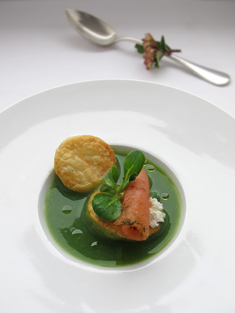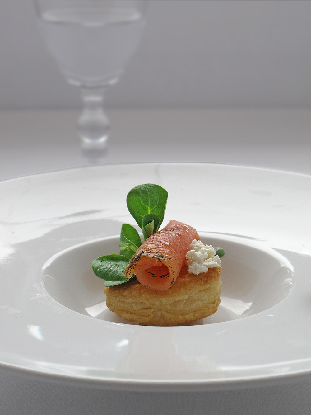 Emplatamos colocando en primer lugar una base de hojaldre, sobre ella un trocito de salmón enrollado como un canutillo, un poco de queso fresco y una hoja de berros o canónigos para adornar.