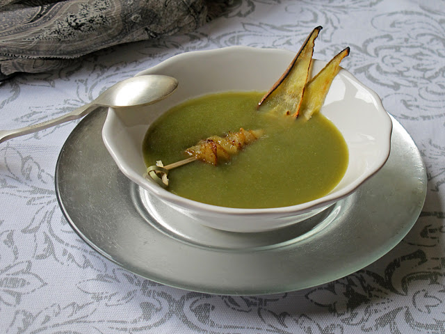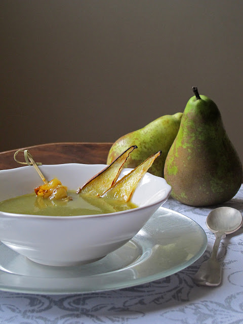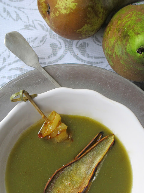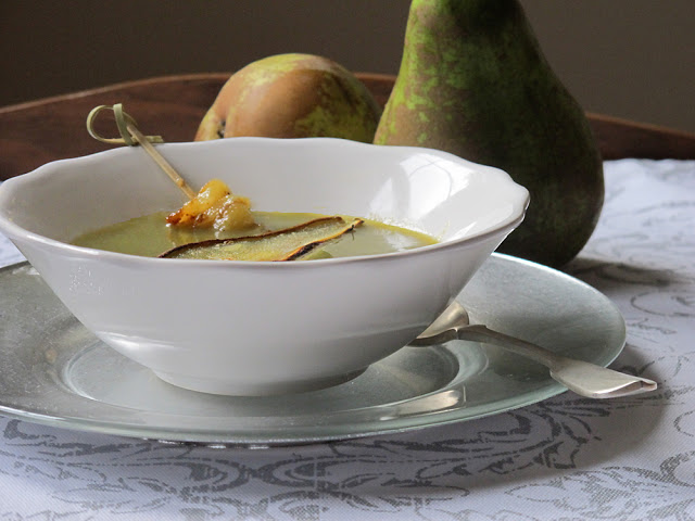 La servimos calentita con los trocitos de pera insertados en una brocheta o si queréis simplemente dentro de la crema, aunque no quedarán a la vista; se irán al fondo, pero el sabor….es lo que importa, así que con el adorno de la pera tostada puede ser suficiente si no os queréis complicar demasiado.