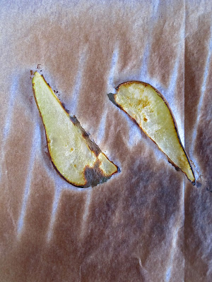 En una hoja de papel de horno, colocamos varias rodajas de pera y la ponemos al grill a 180º hasta que esté crujiente. Unos 15 minutos. Lo podéis hacer mientras se cuece la crema. Las reservamos para adornar.