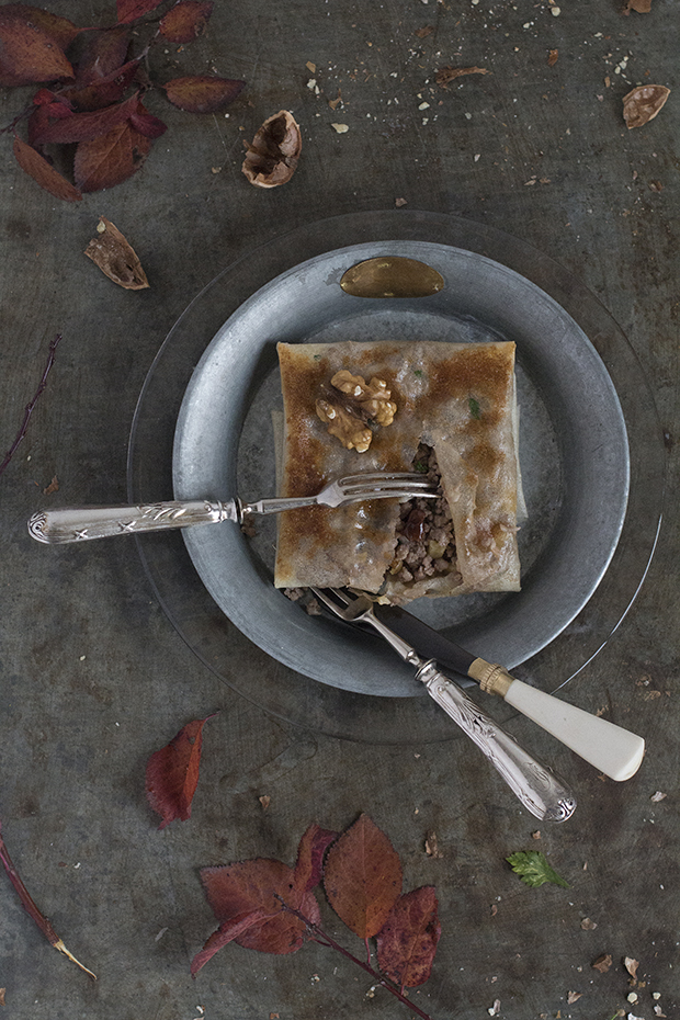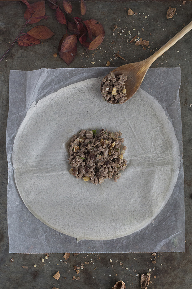 Abrimos una de las hojas de masa brick y colocamos un montoncito de la pasta de carne en el centro. Envolvemos como si fuera un paquete y pincelamos con mantequilla derretida.