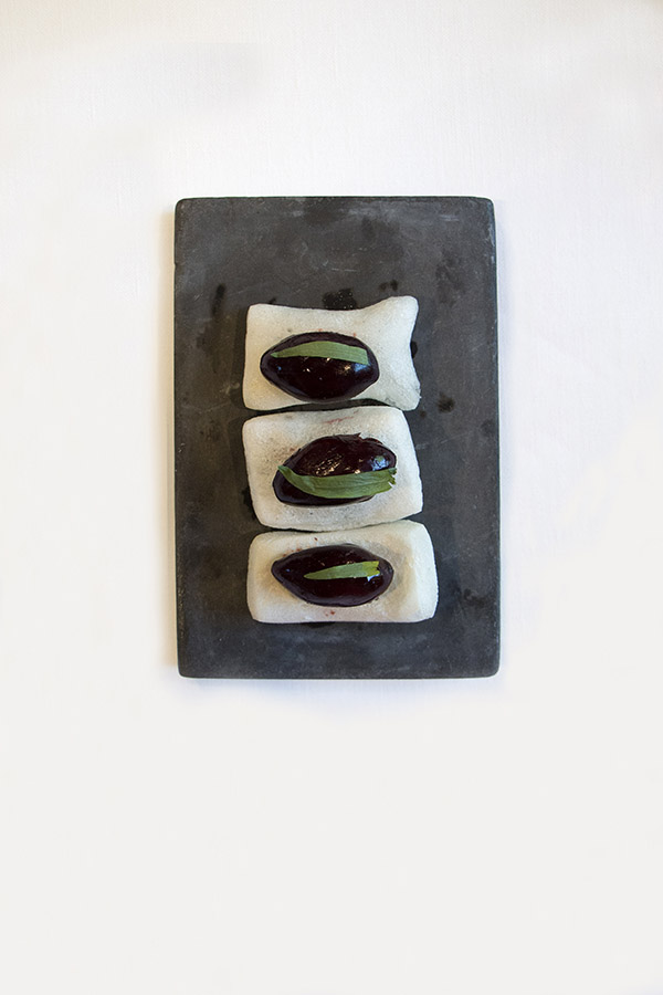 “Sepia con guisantes” pesto de guisantes, coral y tinta de sepia.