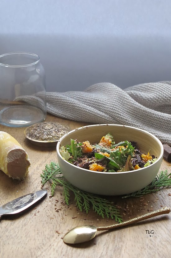Sé que aun falta aun un mes para Navidad, pero soy de las que les gusta planificar. En Nochebuena no perdonamos el Capón, la mamá de mi marido lo pone fenomenal, a partir de ahí, cada año nos gusta variar. El 25 siempre lo celebramos con mis padres, y solemos debatir el menú, porque nos gusta que sea algo diferente a la vez anterior. Esta ensalada de mango chocolate y foie podría ser una opción perfecta.