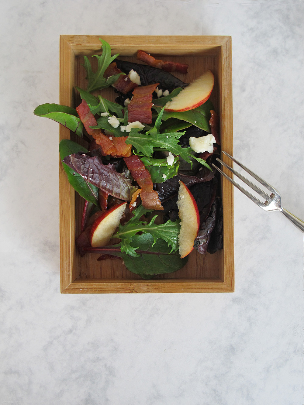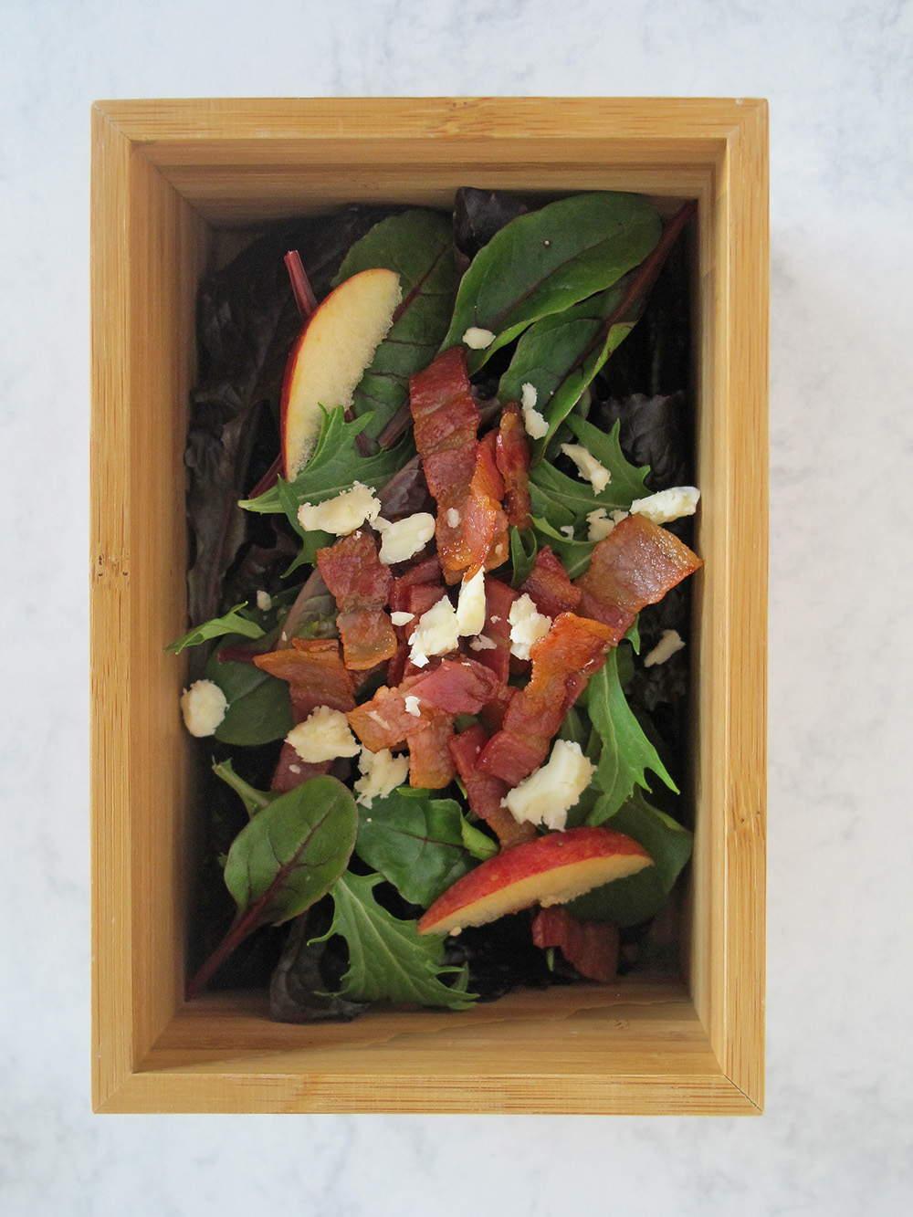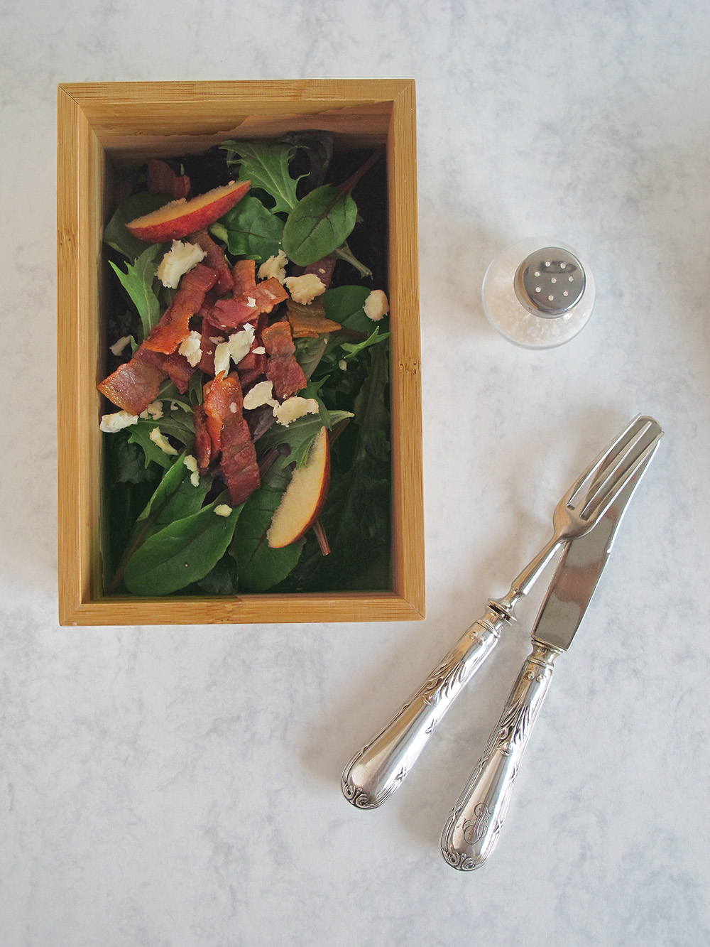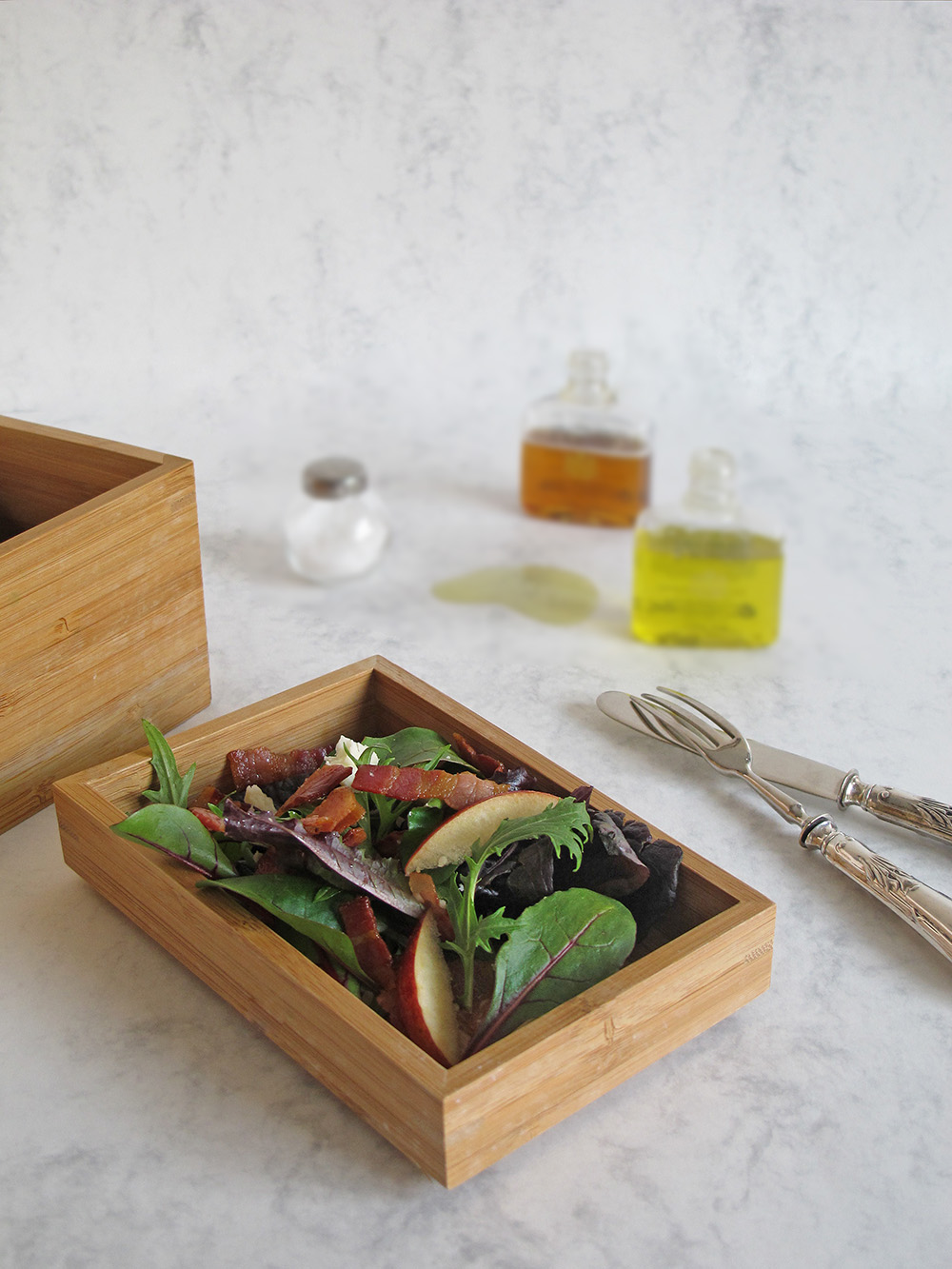 Buscáis sorprender de verdad en una cena? pues yo os doy una idea. Presentad una ensalada apetecible, como ésta de bacon, manzana, queso y miel, dentro de una caja de madera; las tenéis en Ikea y luego las podréis reutilizar.