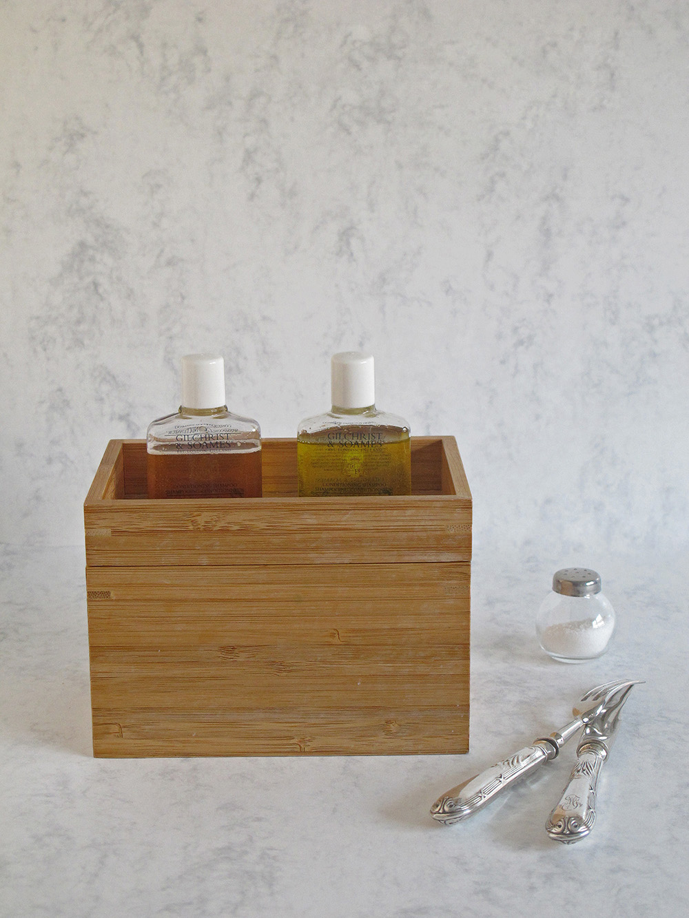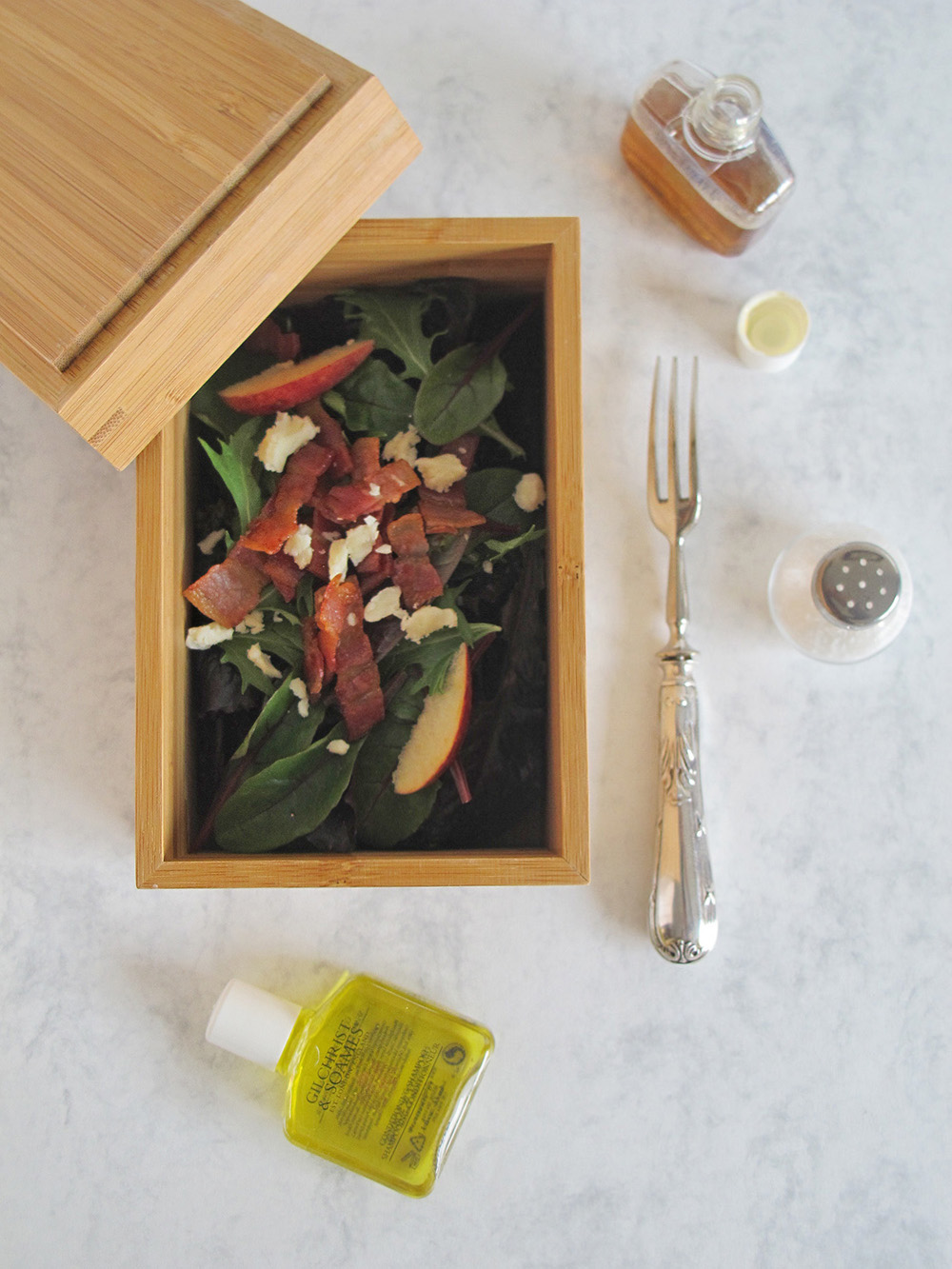 La ensalada dentro de la caja, oculta. Y el aderezo a la vista pero disfrazado a juego con la caja, que es una caja para guardar algodones o cosas por el estilo. La tengo en el baño. La miel a un lado y al otro el aove en sendos frasquitos de champú de un hotel.