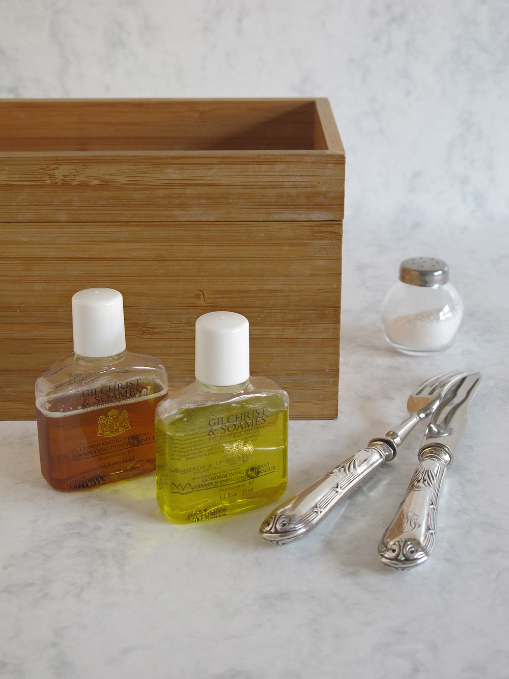Dejad fuera sólo algún elemento relacionado con la ensalada, como he hecho yo; el aove y la miel, pero en botecitos de gel o champú!….. si no disponéis de ellos seguro que se os ocurre alguna otra idea. Podéis recuperar los de las muestras de colonia que vienen en las revistas o que dan en las tiendas. Lavadlos bien… unos días antes incluso, para que no haya ni rastro de lo anterior.