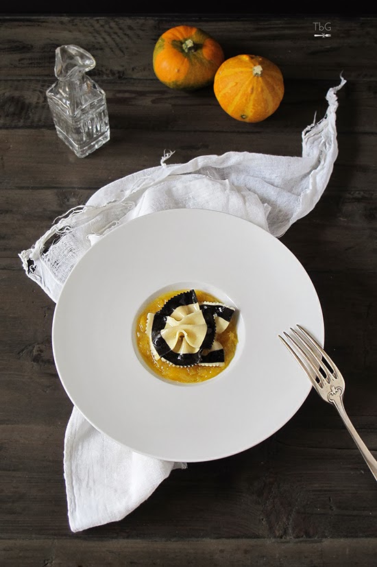 Unos farfalle de pasta fresca vestidos para la ocasión con elegantes rayas negras y acompañados con una salsa maravillosa, de mango y miel, que os va a encantar. Una propuesta muy sencilla que representa los colores típicos de Halloween; el negro noche y el naranja calabaza.