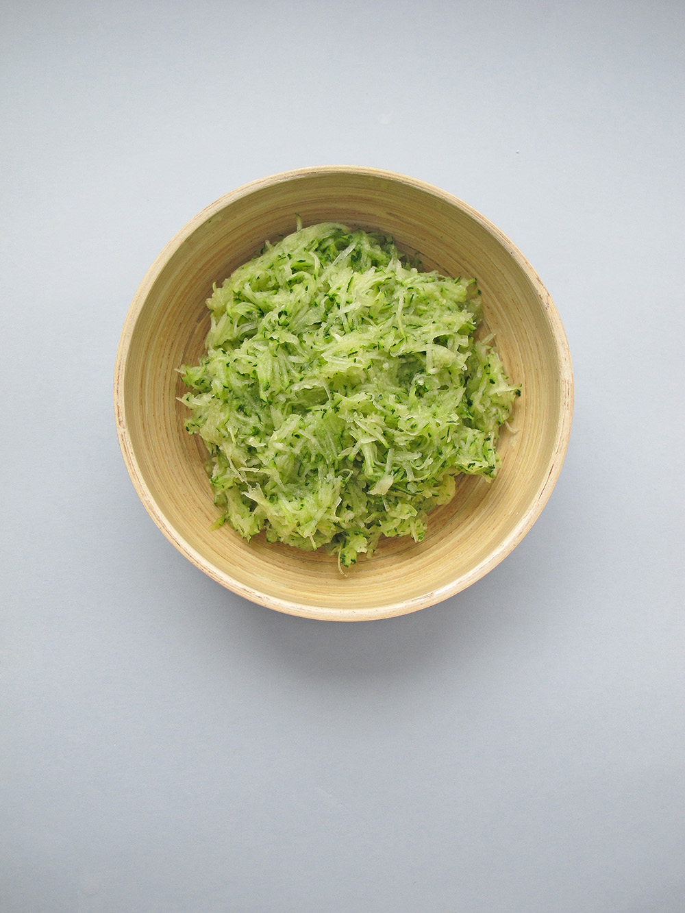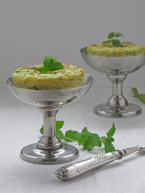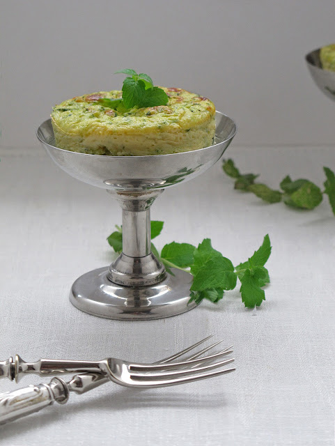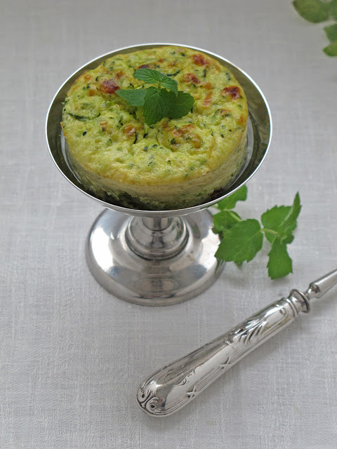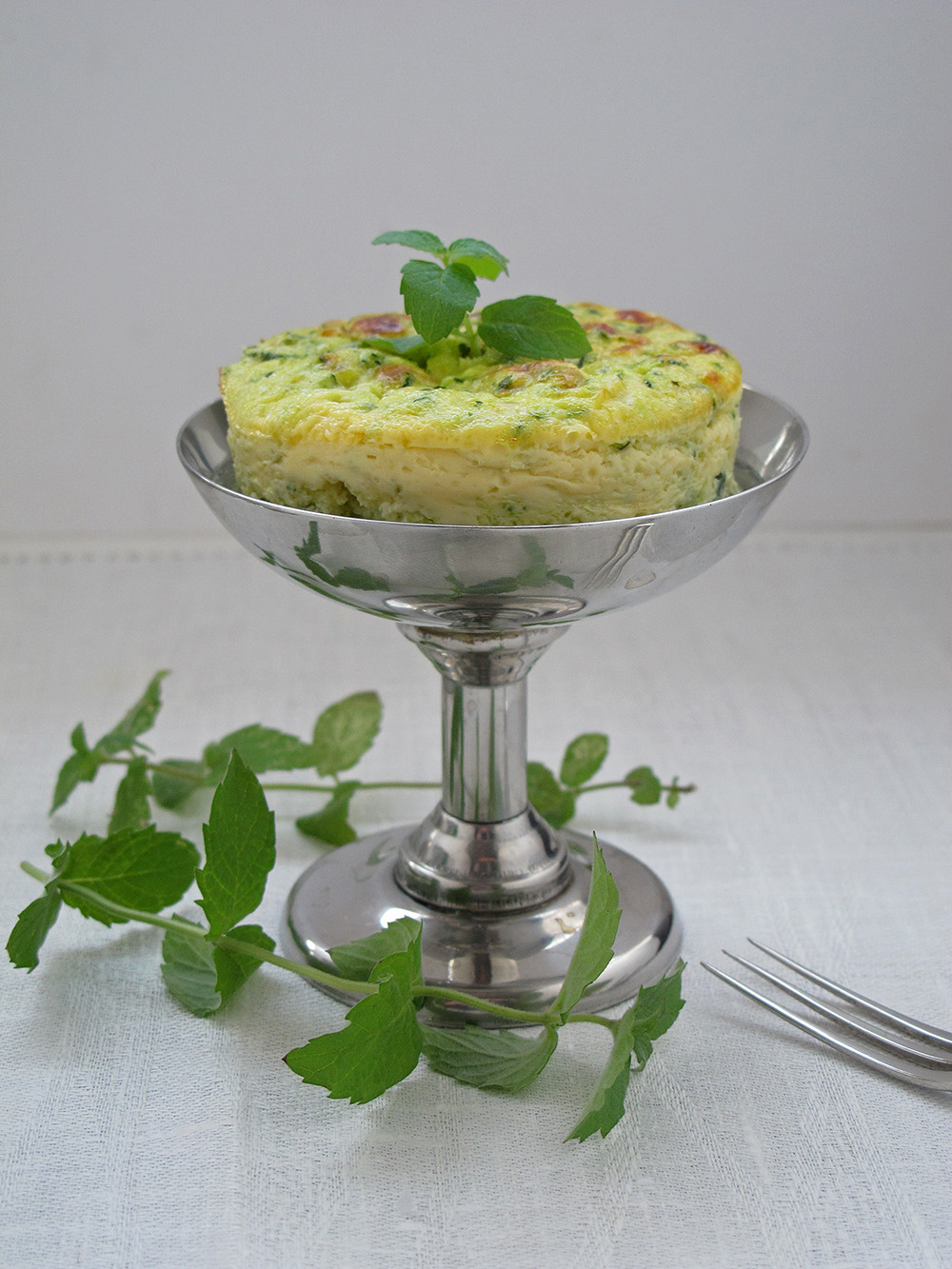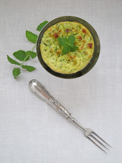 Lavamos y secamos los calabacines y los rallamos. Picamos el ajo, la menta, y el perejil. A continuación en una sartén con un hilo de aceite sofreímos primero un par de minutos el ajo y el perejil, y después añadimos el calabacín, lo salamos, y lo tenemos unos 5 minutos a fuego medio mientras vamos removiendo para que suelte el agua; que no añadiremos al flan.