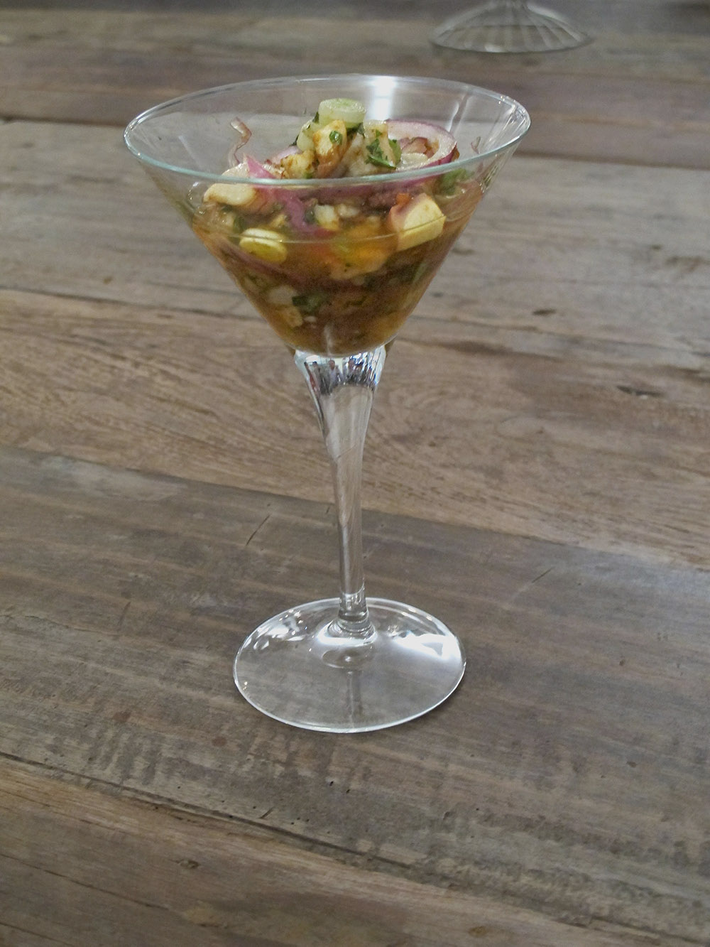 Ceviche de corvina Nikkei Alacachofas con almejas a la marinera.