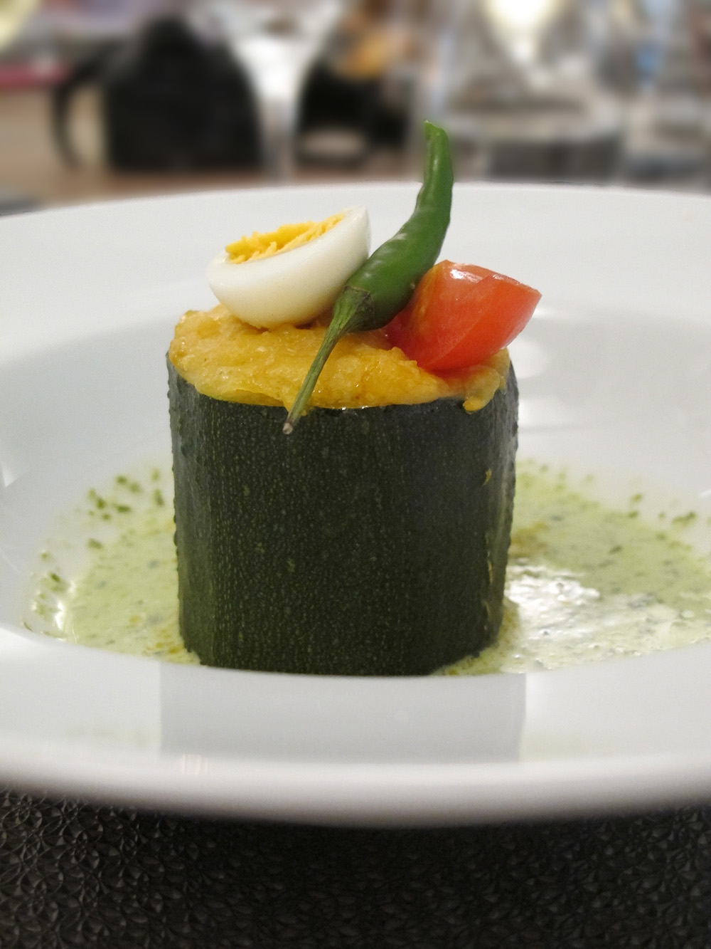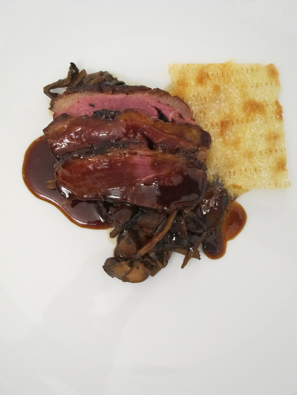 Pastel de choclo, calabacín y carne en crema de albahaca Pato en dos cocciones en su jugo sobre salteado de setas