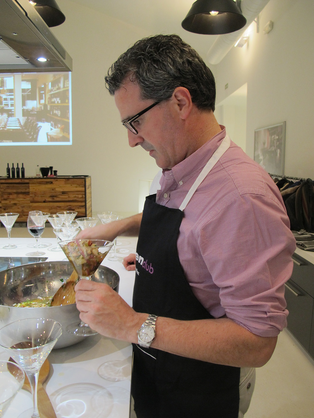 Antes de abordar en ceviche que ya nos esperaba en la mesa. Víctor nos habla de los vinos de El Coto-Barón de Ley, y concretamente de esta filigrana escogida especialmente para la ocasión, y que apenas se comercializa en España, que es la que vamos a degustar junto con otros vinos que aporta Kitchen Club. Un vino compuesto por 7 variedades de uva. Un vino muy especial.