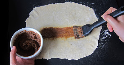 Dividimos la masa en 6 trozos, para 6 Kringles. Extendemos la masa con un rodillo y la pintamos con una mezcla de canela, mantequilla y azucar ( 4 cucharadas, 100 g, y 6 cucharadas respectivamente). Yo he puesto 2 de las de azucar de azucar vainillada.