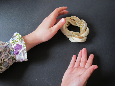 Posteriormente, la enrollamos y la abrimos longitudinalmente en dos sin llegar hasta el final. Luego la trenzamos como os muestro y la cerramos uniendo los bordes. Volvemos a pintar de canela y azucar, e introducimos los brioches en el horno durante 20 minutos a 180º.