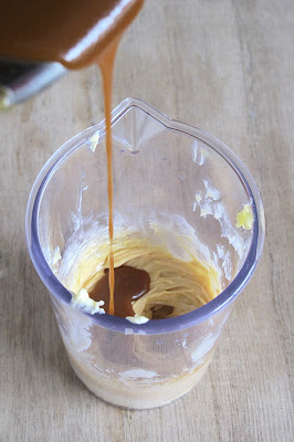 Colocamos la mantequilla en el vaso de la batidora y añadimos la salsa de caramelo, dejando un poco para poder rectificar y que tome el sabor que nos parezca apetecible. Salamos. Finalmente batimos con una varilla eléctrica hasta que monte un poco.