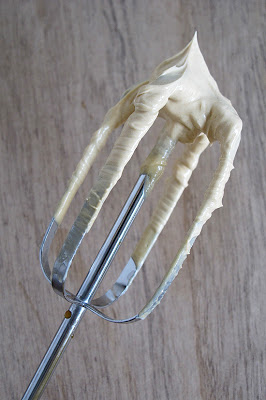 Una vez obtenido lo retiramos de fuego y giramos con movimientos suaves el cazo en el aire hasta que enfríe un poco. Unos minutos. A continuación añadimos la nata y fuera del fuego, y con una varilla, removemos hasta que quede integrado.