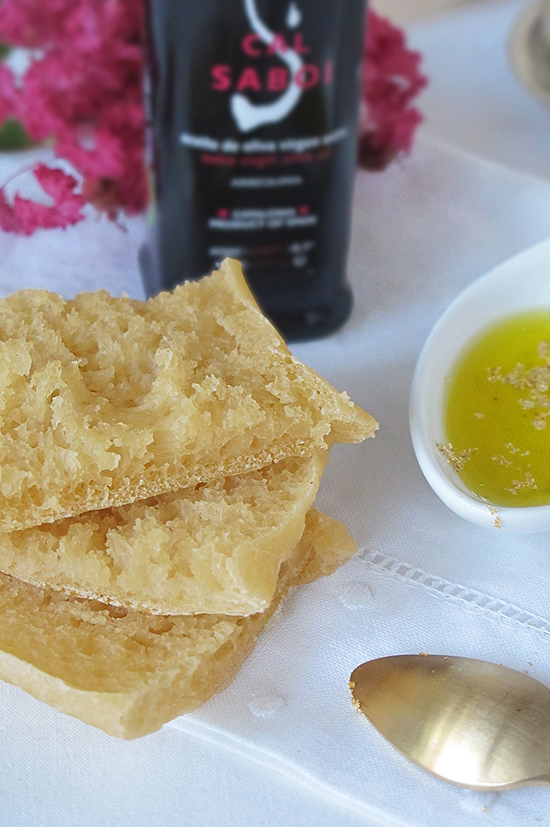 Recordé que tenía en casa un maravilloso aceite de Cal Saboi pendiente de estrenar, y en un formato que me encajaba perfectamente para seguir recreando escenas de vacaciones sobre el mantel de mi propia mesa. Un formato mini, como el de los hoteles y restaurantes. Ideal.