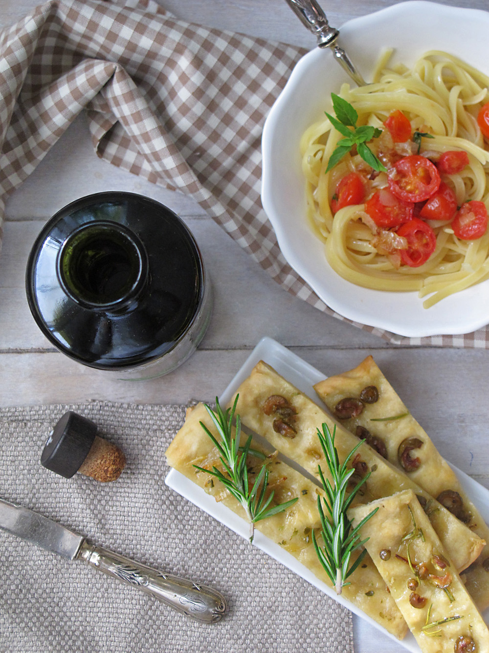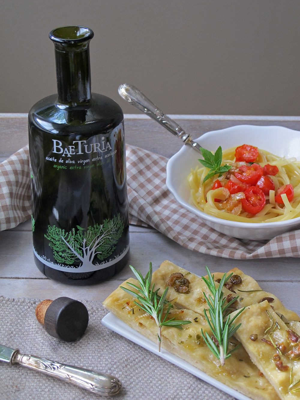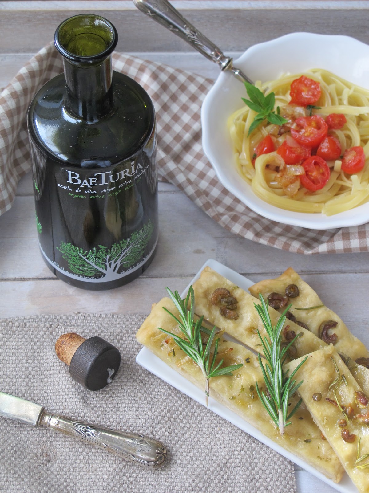 Un plato de pasta aromatizado con pequeñas hojas de albahaca recién cortada; ya no es temporada y ahora la albahaca de hoja grande ya no se encuentra. Y un par de focaccias; la de cebolla y orégano y la de aceituna y romero. Todo ello regado con aceite Baeturia.