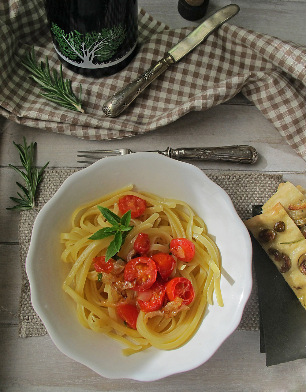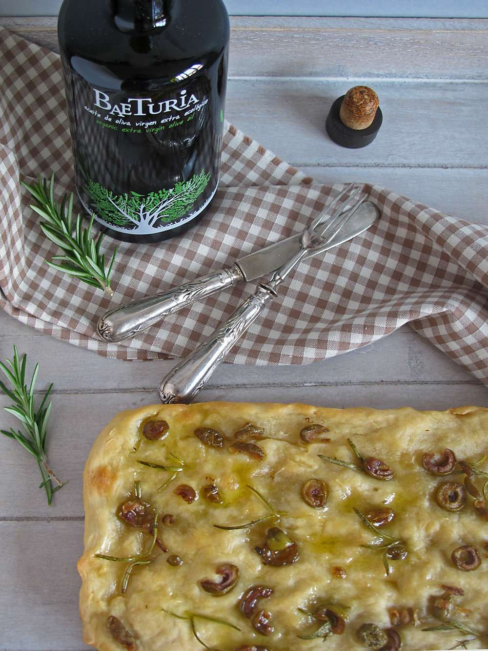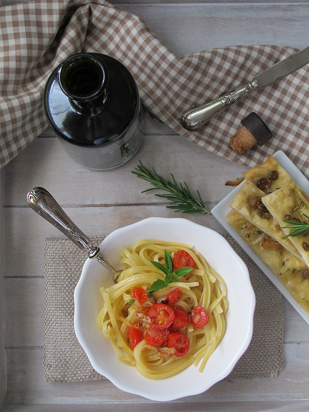 Un plato de pasta aromatizado con pequeñas hojas de albahaca recién cortada; ya no es temporada y ahora la albahaca de hoja grande ya no se encuentra. Y un par de focaccias; la de cebolla y orégano y la de aceituna y romero. Todo ello regado con aceite Baeturia.