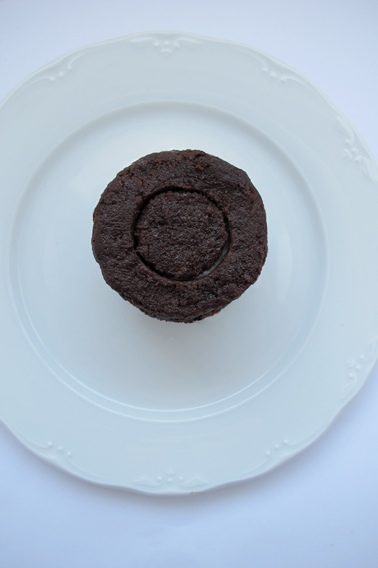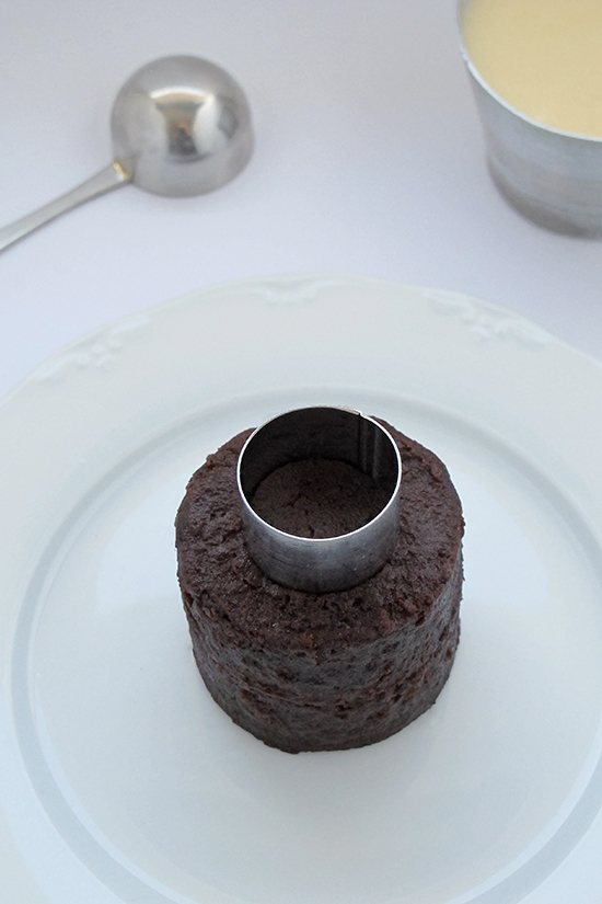 A continuación vaciaremos el corazón del pastel, pero sin llegar hasta abajo del todo. Yo he utilizado otro aro más pequeño, pero podéis marcar el círculo con lo que tengáis a mano y vaciar con el palito de una cuchara. No es necesario que quede perfecto.
