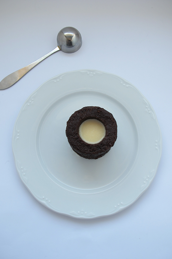 Un exquisito pastel de chocolate negro que sabe a anís, con una mousse de chocolate blanco en su interior, como un coulant, pero de dos chocolates. O como un pastel de chocolates, pero en dos texturas.