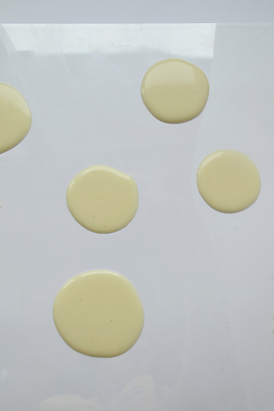 Mientras, pasamos a fundir el chocolate blanco. Este a mí me gusta hacerlo al baño María, o sea con las onzas metidas en un bol y éste dentro de un cazo en el fuego. Hay que remover continuamente, y hacerlo a fuego medio. Cuando esté líquido, colocamos unas gotas sobre papel de plástico de repostería ( o papel de horno podría servir también ) para hacer estas chocolatinas. Con la primera opción es muy cómodo, se deja un montoncito y se golpea por debajo del plástico con la palma de la mano, o los dedos, para que la gota se estire y se aplane.
