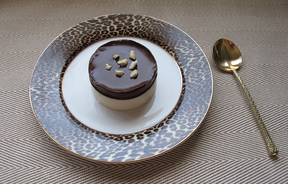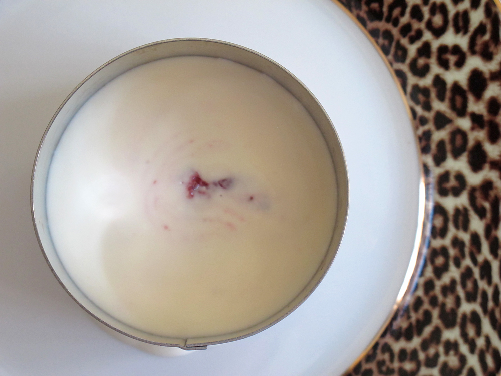 Llevar al frigo y, cuando veamos que comienza a espesar, verterlo dentro de un aro de emplatar colocado sobre el plato que irá a la mesa. Incorporar una o dos frambuesas y llevar a la nevera.