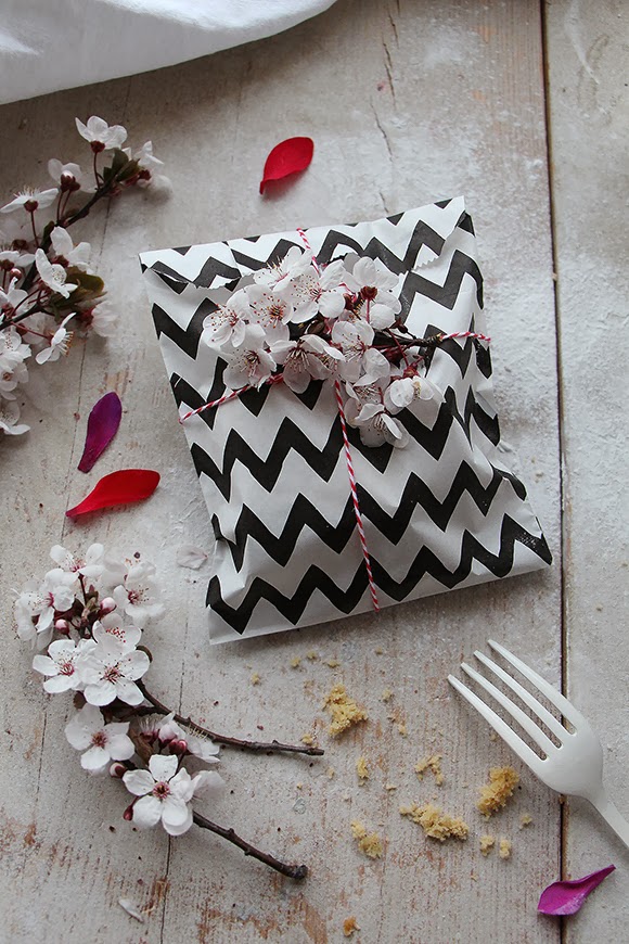 Otra opción, para entregar como detalle, es empaquetar un par de rebanadas de este rico plum cake en una bolsita de papel como ésta; Chevron negro a rayas.