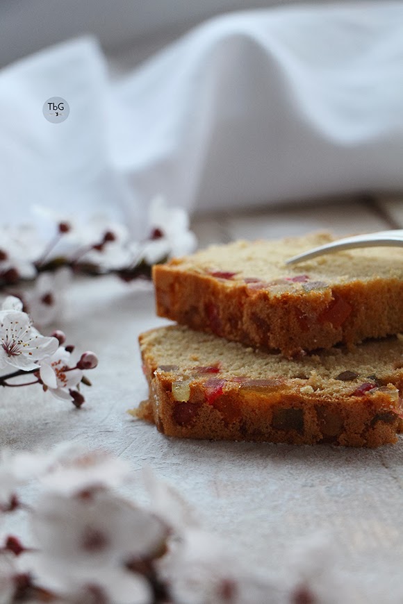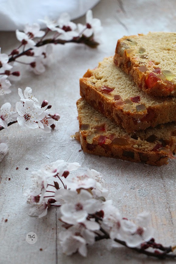 En esta ocasión os traigo esa combinación clásica de frutas y licor. En mi caso frutas escarchadas de las que me sobraron en Navidad que tenía guardadas sin un claro fin o propósito; troceaditas y de muchos colores quedan fenomenal en el corte.