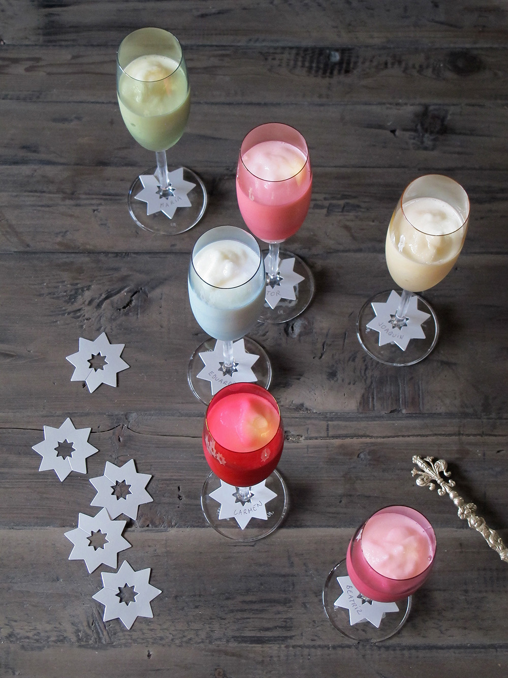 A mí el gris me parece super elegante y combina bien con todo. Sirven además para identificar las copas, cuando son todas iguales y el número de invitados y las circunstancias se prestan a que uno olvide cuál era la suya. Son muy resistentes, no se manchan, y yo diría que se les puede dar más de un uso, siempre que los nombres coincidan evidentemente.