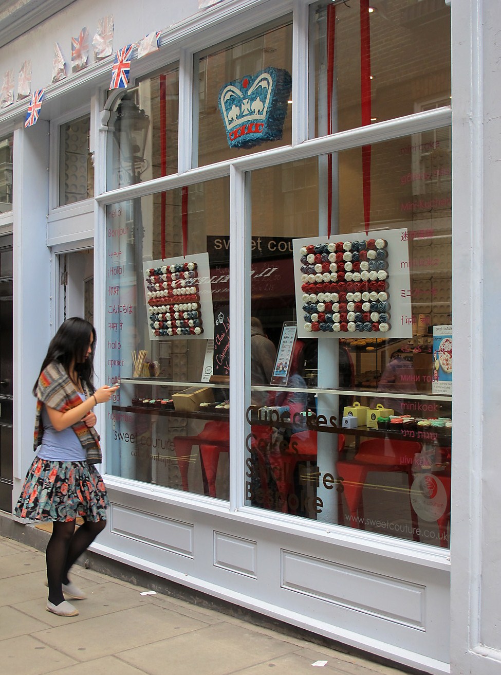 Aquí os dejo una muestra de bakery, especializada en cupcakes. Se trata de Sweet couture. Está en una zona de Londres que me resulta muy agradable para pasear; los alrededores de Covent Garden. Está en el 23 de New Road. Yo estuve por allí en el mes de Julio, en plenas olimpiadas, por eso véis tanta banderita y los cup cakes formando ese dibujo tan patriótico.