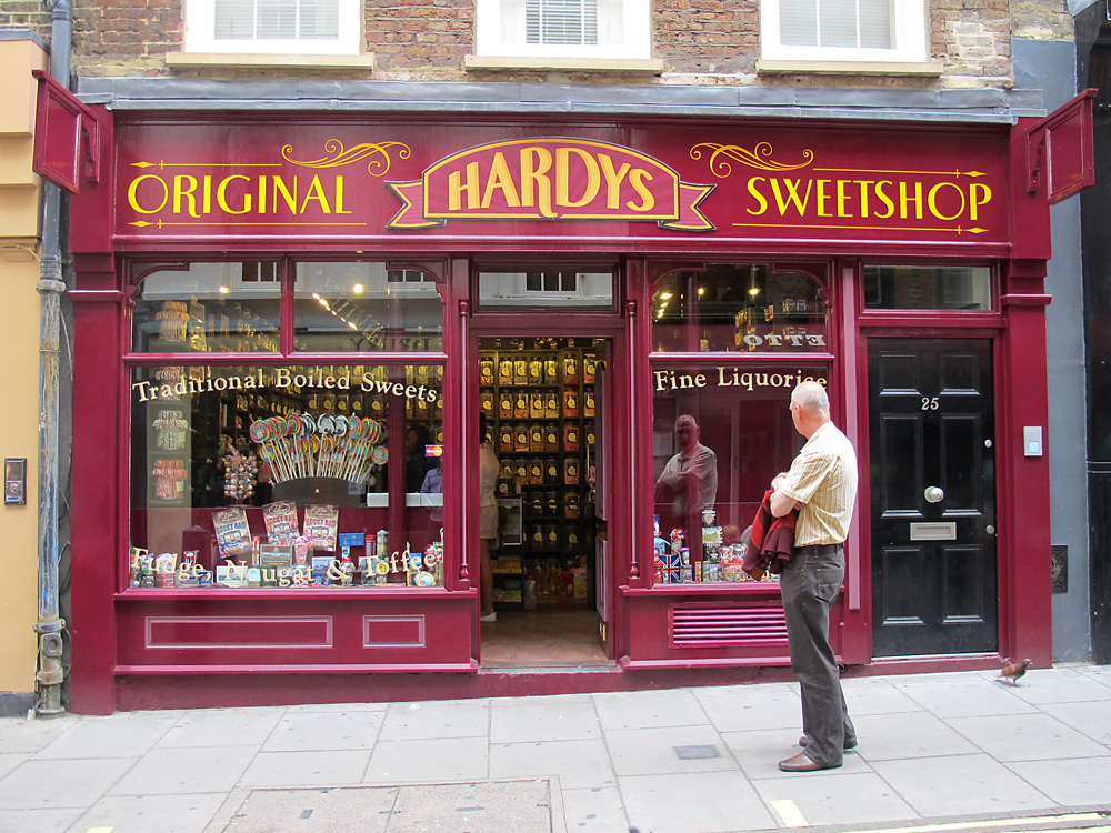 En la misma calle encontramos una tienda que me encanta. Es una tienda antigua de caramelos. Se trata de Hardys . Se describen a sí mismos como una ” Old fashioned sweet shop” que pretende crear una atmósfera nostálgica, evocadora de Charlie y la fábrica de chocolate, Harry Potter o la tienda de un cuento de la época de Dickens.