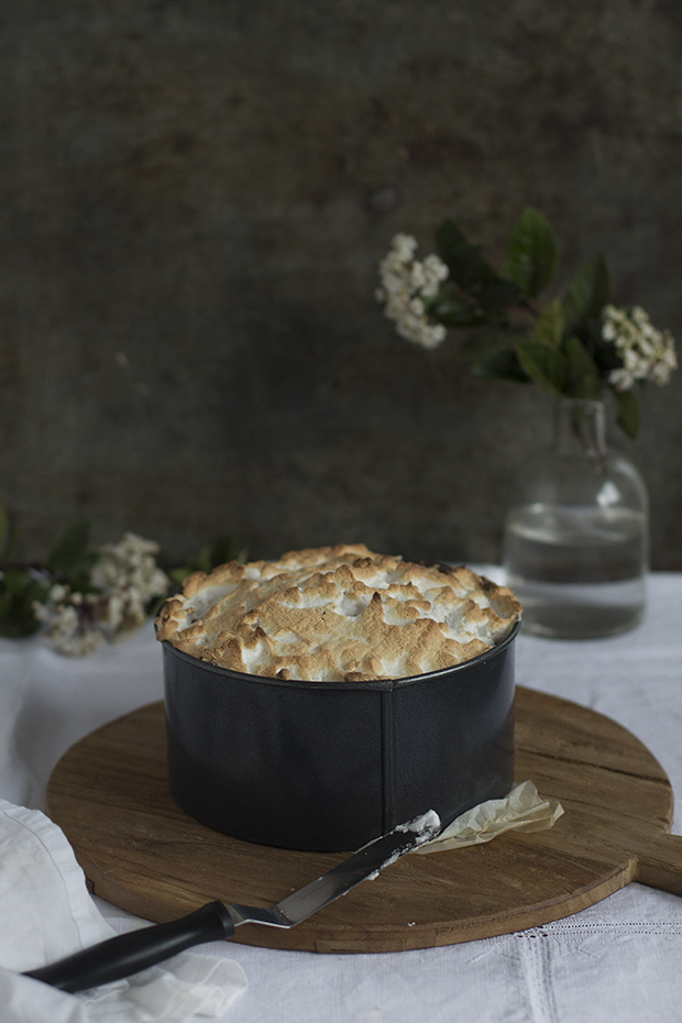 Añadimos el contenido del bol al merengue y lo removemos con suavidad. A continuación lo colocamos sobre el bizcocho de chocolate, sin desmoldar y lo volvemos a meter en el horno por segunda vez el tiempo justo y necesario para que se dore el merengue; unos minutos. Esperamos a que se enfrié para desmoldar.