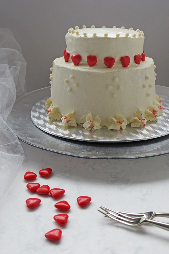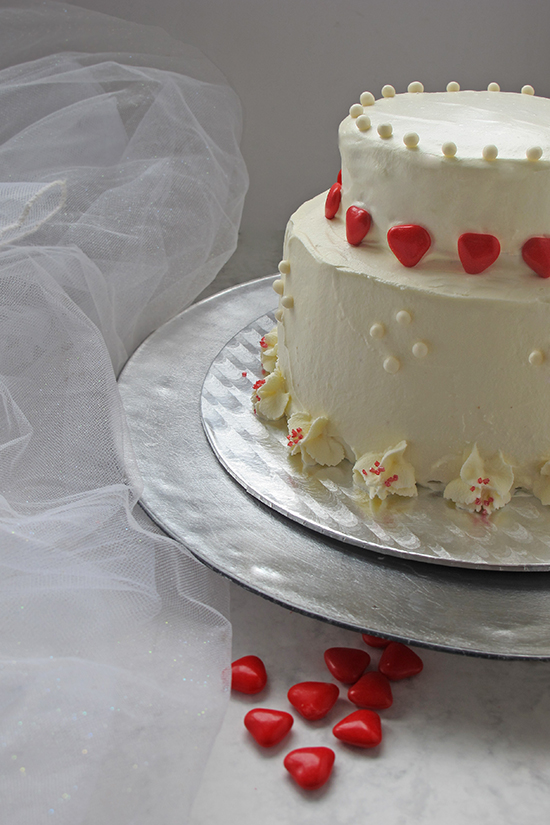 El color rojo marcó la estética del pastel, y como quería conseguir un resultado elegante y delicado pensé en que no debía llevar ningún otro color más que el de la crema de merengue suizo y mantequilla.