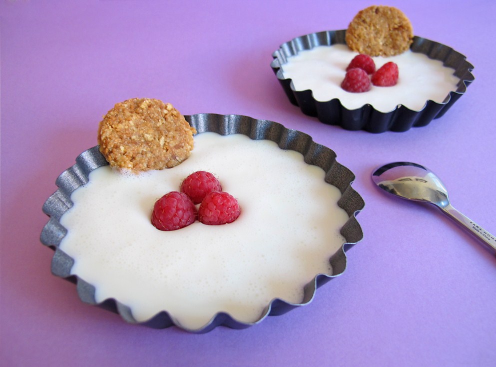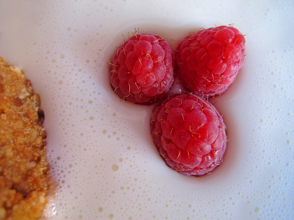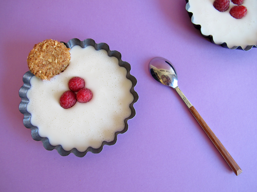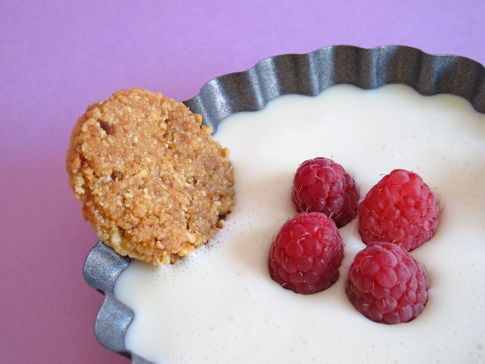 Servir la crema de queso fría y añadir unas frambuesas. Colocar a un lado la base de la tarta como si fuera una galleta. Sobre la mesa podéis dejar más galletas y más frambuesas para que quien lo desee componga su tarta con más base o más fruta.