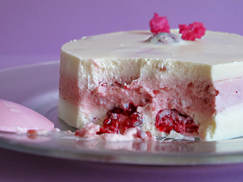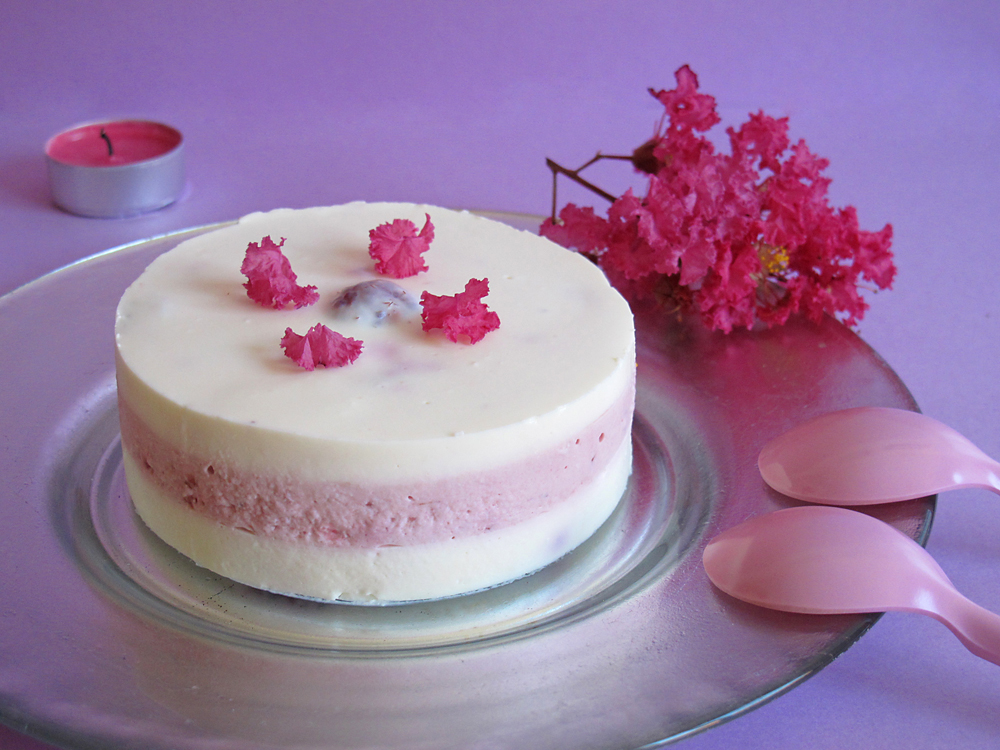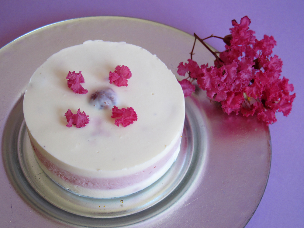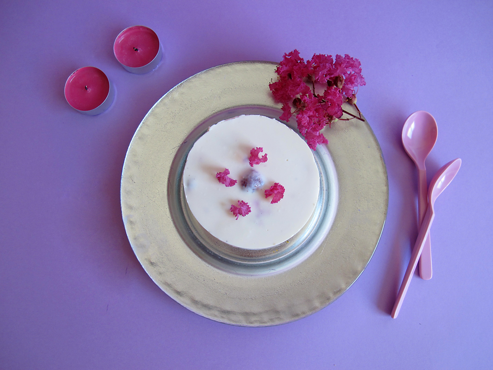 Inventé así, la tarta mousse de queso y frambuesa para dos. Con flores del árbol de Júpiter o árbol del amor.
