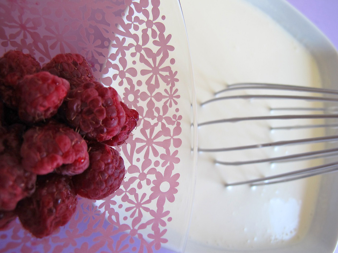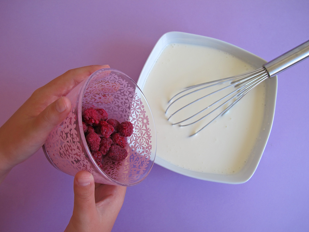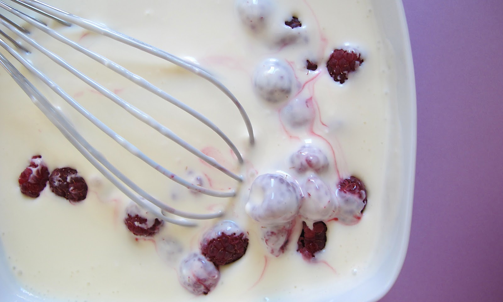 Añadimos la mitad de las frambuesas e integramos con una varilla o espátula.