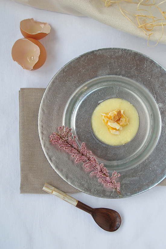 Primero una capita de puré, luego el huevo, luego otra capita de puré, luego la cebolla crujiente.