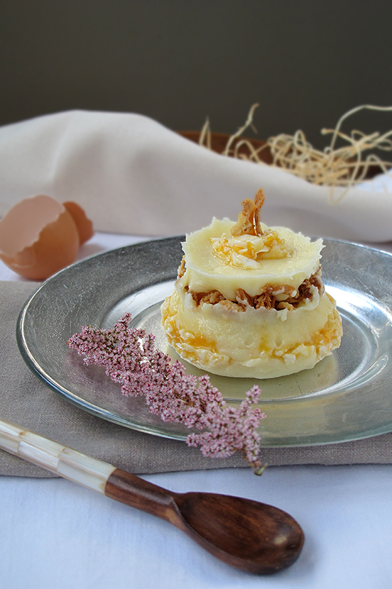 Por último otra capa de puré. Y finalmente adornamos con un poquito de huevo y cebolla, o si os apetece una flor, o un poco de trufa rallada…. que era mi intención pero luego se me olvidó con el estres de las fotos.